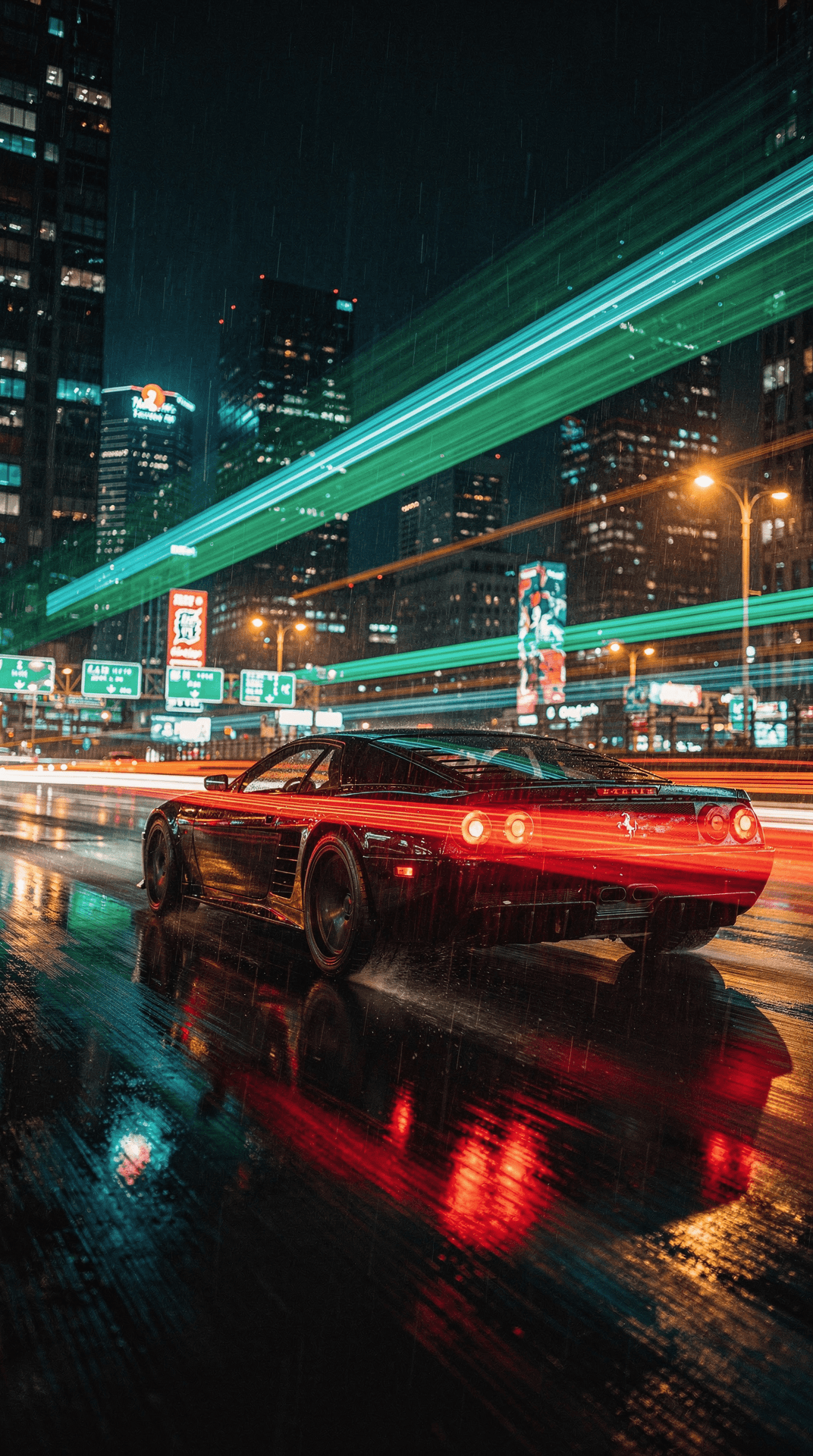 A black sports car with red LED tail lights blurs violently across a wet night highway. [...]